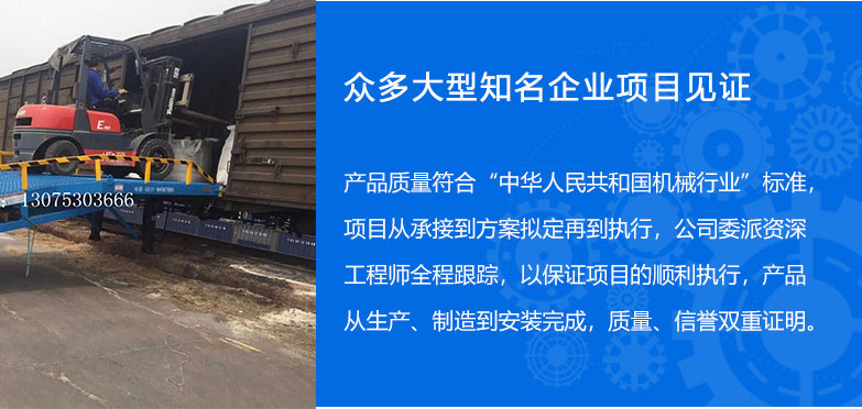 >> 13年的登車橋設備制造經驗 集設計、研發、生產和銷售于一體的制造型企業,專業制造液壓登車橋,移動式登 車橋和高空作業平臺,經驗豐富,擁有強大的成產技術和完善的管理模式。 >> 引進國際先進施工工藝 配備整套專業自動化生成設備,引進國外先進技術, 定期培訓,確保設備的高品質。 產品具有設計新穎、結構合理、升降平穩、載重安全、操作簡單、維護方便等優點。